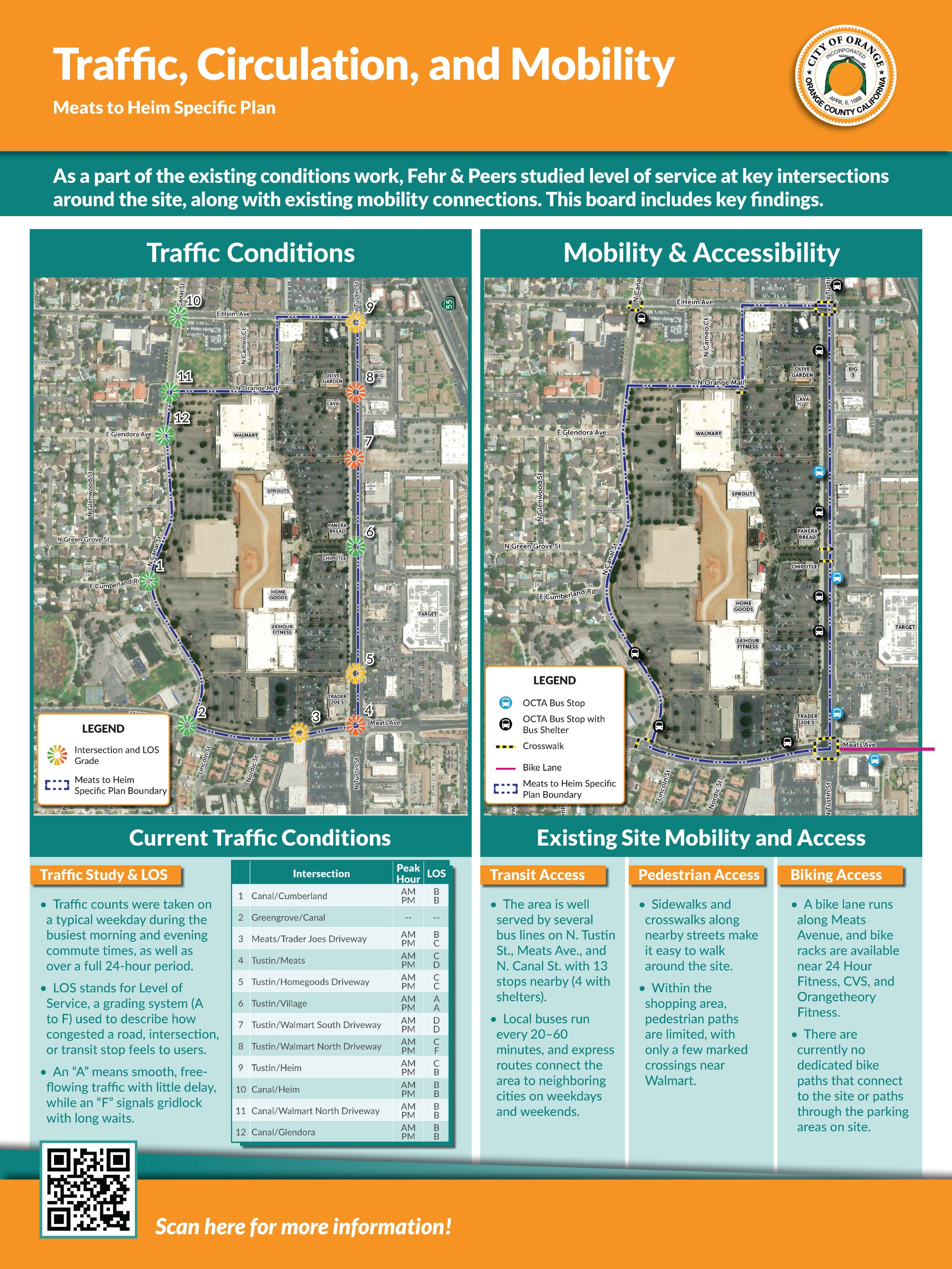 The boards below highlight key findings from the traffic study prepared by Fehr & Peers and include a map showing existing circulation and connections throughout the site.